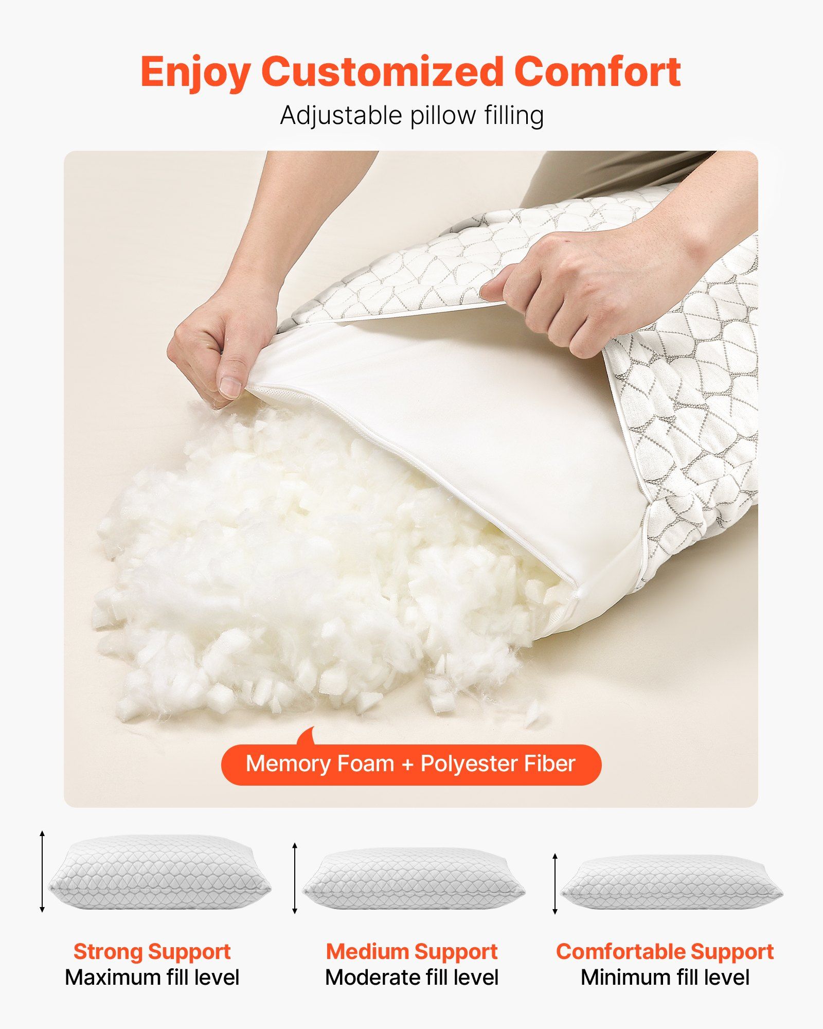 1.Customizable Comfort: This King Size bed pillow is filled with premium memory foam that adapts to your neck curve for ideal support. Extra 1/2 lbs filling allows you to adjust height and firmness for personalized comfort