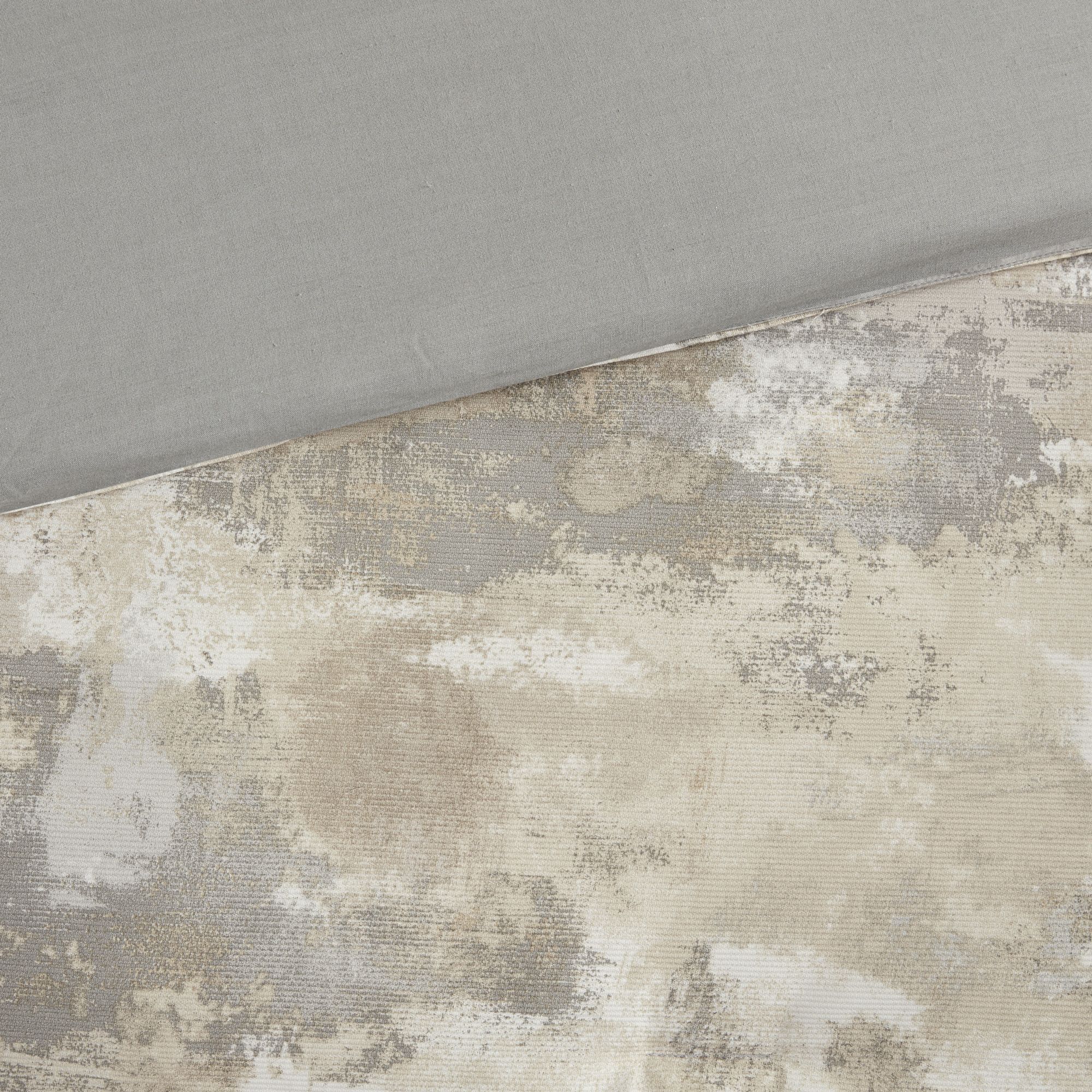 Modernize your bedroom decor with the chic styling of the Madison Park Beacon 7 Piece Comforter Set. This luxurious comforter features an abstract print in various gray, taupe and cream color on the cotton-rich ottoman weave face with a solid grey reverse to create a glamorous look. The 2 matching shams mirror the abstract design of the comforter, while 3 coordinating decorative pillows with embroidered details add the finishing touches. A complementary solid grey bed skirt provides a clean finish to complete this modern comforter set. This bedding set is also OEKO-TEX certified, meaning it does not contain any harmful substances or chemicals to ensure quality comfort and wellness. Items in the set may come in a rolled or compressed packaging, which will need to be fluffed up or steam ironed before use to remove wrinkles.