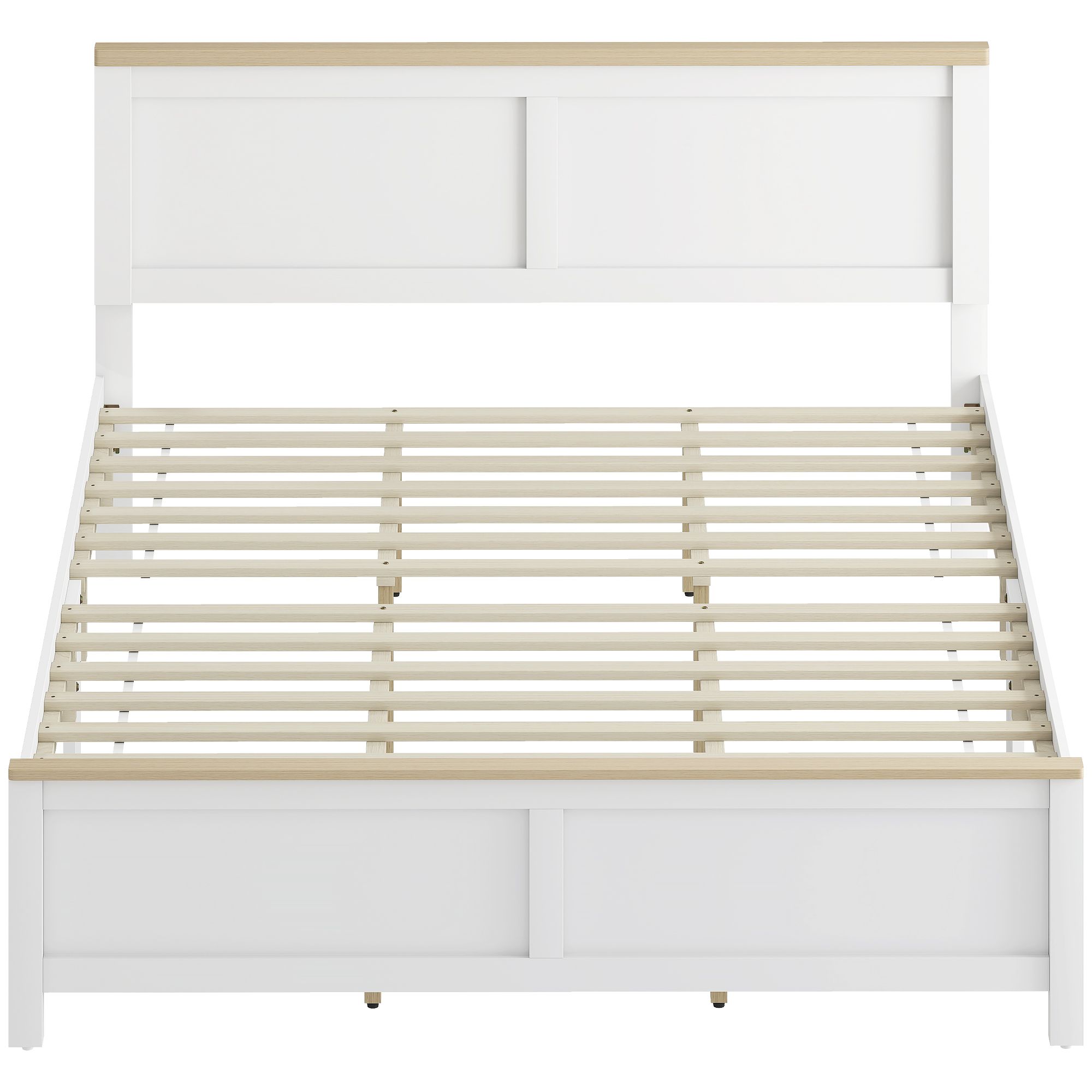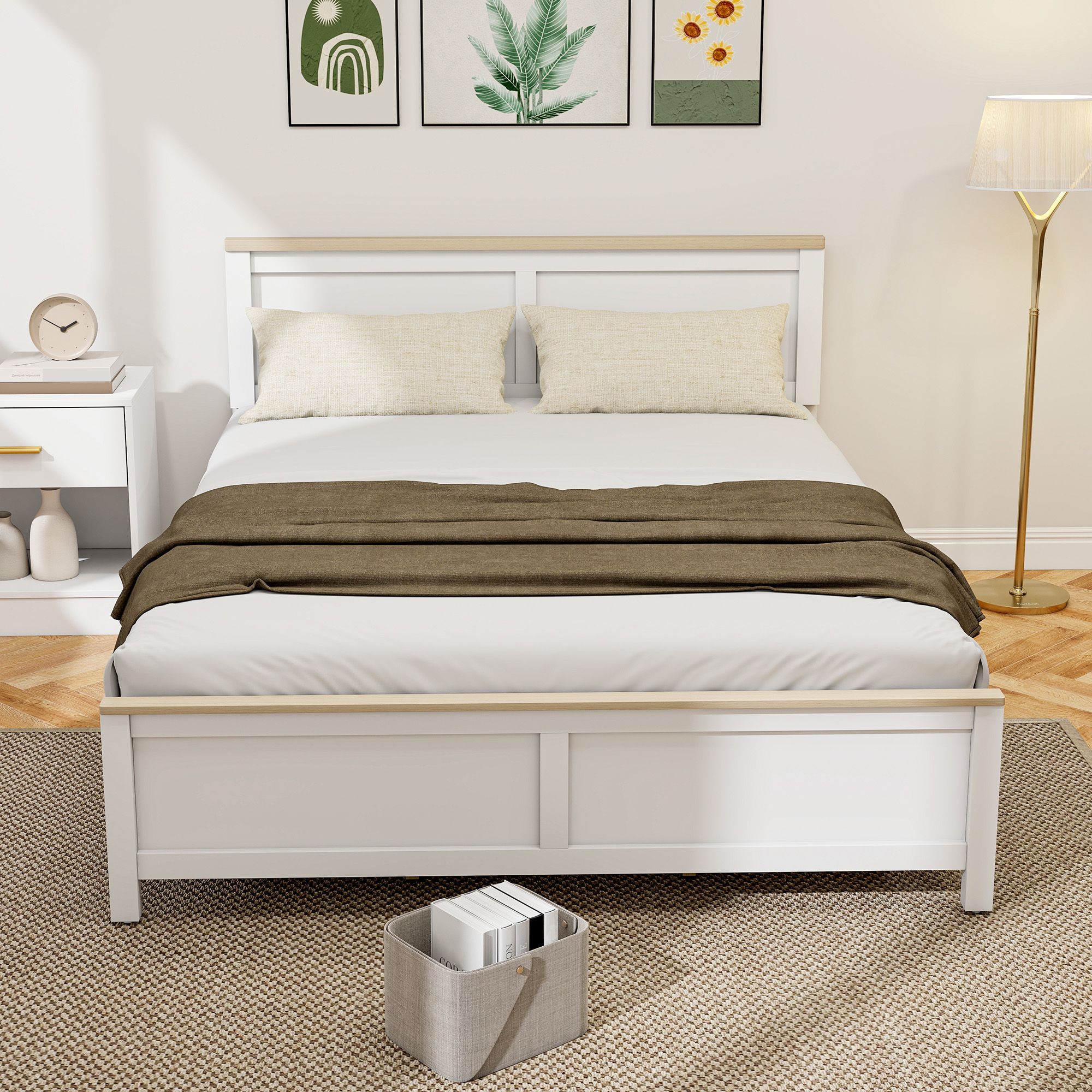 1.- Modern Minimalist Style: Clean white frame paired with wood-grain tops, the queen bed frame blends effortlessly into any bedroom decor, elevating your space with a fresh, timeless look