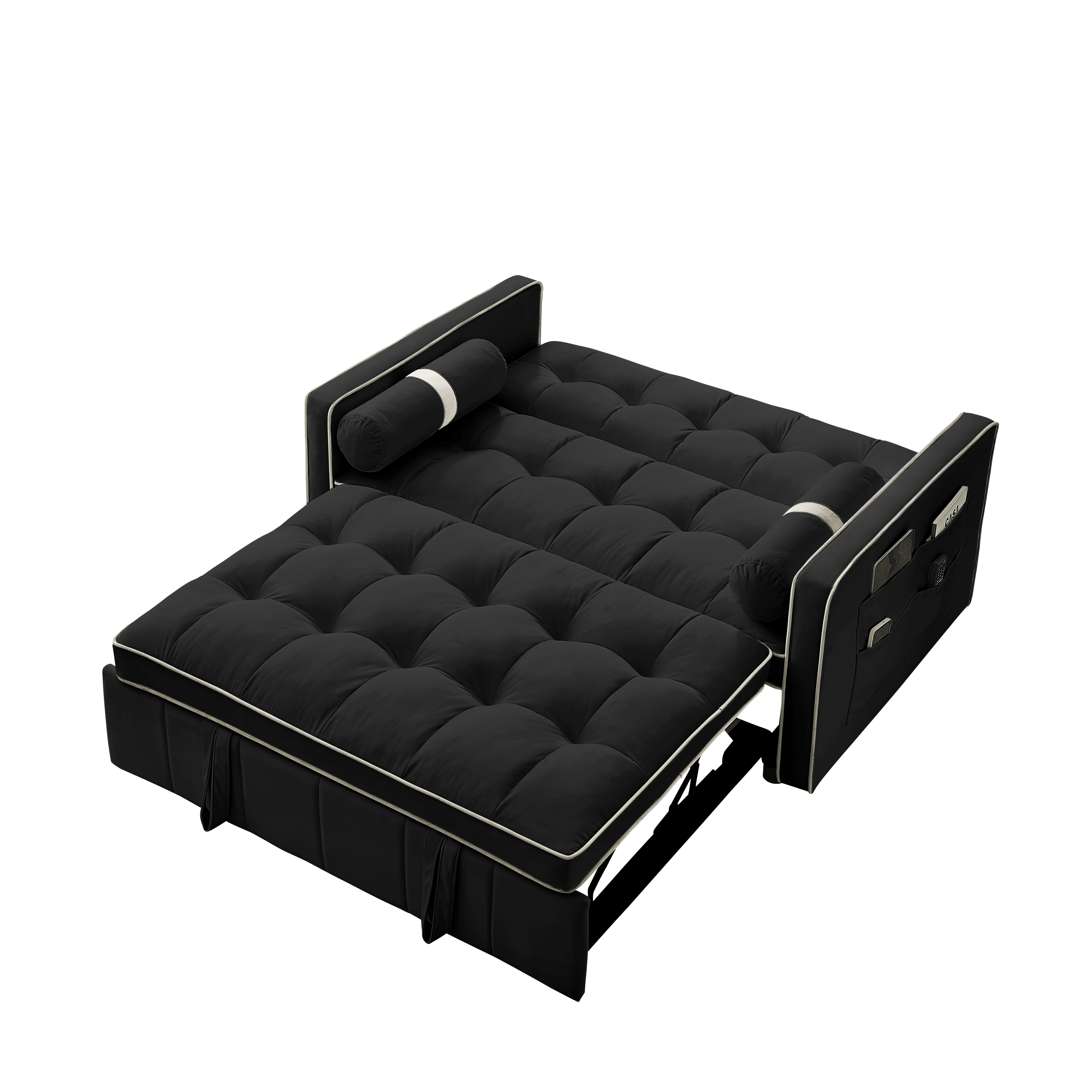 1. Multifunctional pull-out sofa bed. By pulling out and lifting the bed frame under the seat and lowering the backrest, this double position sofa can be quickly converted into a bed for resting use.2. Adjustable and super strong: soft high-grain velvet fabric and high-density foam, the backrest can be adjusted to 3 positions, 105°-180° recline or lie flat, it can be used for listening, playing games, reading, and sleeping. It will make you feel relaxed and comfortable.3. Suitable for any scene: this multifunctional pull-out sofa bed can be placed in living room and bedroom, it can accommodate 2 people to watch TV, play games or read, it can be used for guests or children's bed, modern design and space saving. This is definitely a good choice for applicable small rooms, apartments, studios, offices.4. Perfect function: it has two straps to assist pull out can quickly turn the sofa into a bed. Pull-out with a bed made of high quality foam and metal iron frame can steadily support you to lie on the bed.5. storage pockets and soft pillows. Our sofa comes with two side storage bag for you to reach and use to store your TV remote, cell phone, glasses or books. Also includes two soft pillows for added back support or sleep.6. Easy to assemble and use. Easy-to-follow instructions ensure the perfect build and pull-out recliner setup is quick and easy. If you need a video, please contact me.
