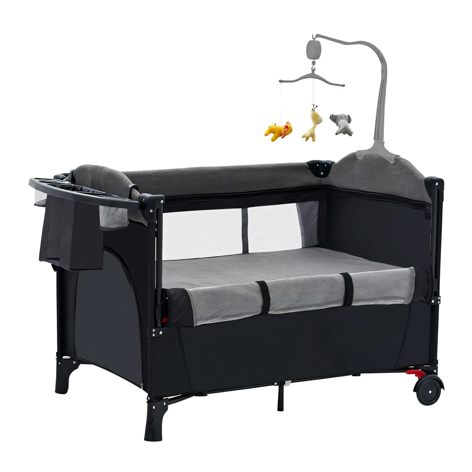 6 In 1 Foldable Baby Crib with Activity Center Diaper Changing Table Mosquito Net Mattress Music Box Toys Storage Tray Baby Bassinet Baby Sleeper