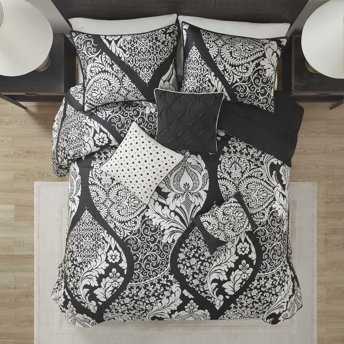 The Madison Park Vienna 7 Piece Cotton Printed Comforter Set offers an eye-catching update to your bedroom decor. A beautifully intricate damask pattern is flaunted across the comforter and shams, for a chic transitional look. The solid reverse perfectly complements the top of the bed, while the flange border adds a charming accent to the comforter. Three decorative pillows with embroidered details and fabric manipulation and a solid bed skirt complete the comforter set. Made from 100% cotton sateen, this bedding set is OEKO-TEX certified, meaning it does not contain any harmful substances or chemicals to ensure quality comfort and wellness.