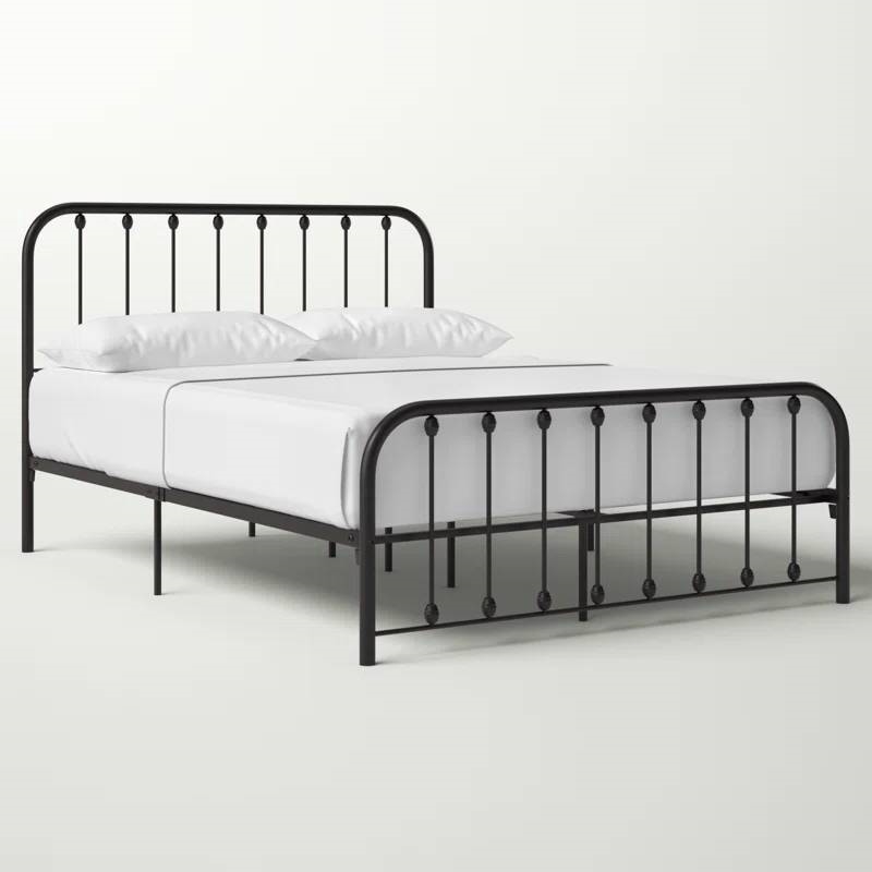 This Queen Classic Black Metal Bed Frame with Rounded Corners Headboard and Footboard brings a classic, minimalist feel to your bedroom. Crafted from metal, it features a slatted headboard with a tubular design and rounded corners for a traditional wrought iron look. Diamond-shaped finials cap off each slat for a geometric touch. We love that this bed has center legs that provide additional support. Best of all, it comes with an 11-piece slat kit and center supports, so a box spring is not necessary all you need to add is a fitting mattress of your choice (sold separately).