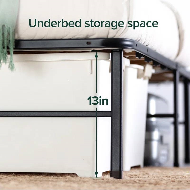 Crafted with so much strength, simplicity, and practicality that you’ll want one for every bedroom, the Full size Metal Bed Frame with Bamboo Wood Slats will become your new furniture MVP. This steel and bamboo platform bed is designed to support your beloved mattress, be it spring, memory foam, or hybrid, with superior strength and box spring-free support. When paired with our rock-solid steel frame, sustainable bamboo slats offer outstanding, natural durability that will support you and your mattress for years to come. This expertly engineered design even features additional center support legs and closely spaced slats to prevent sagging and extend mattress life. At 14 inches tall, the Full size Metal Bed Frame with Bamboo Wood Slats gives you nearly 13 inches of clearance space for storage under the bed, so you can keep things always organized and out of the way.