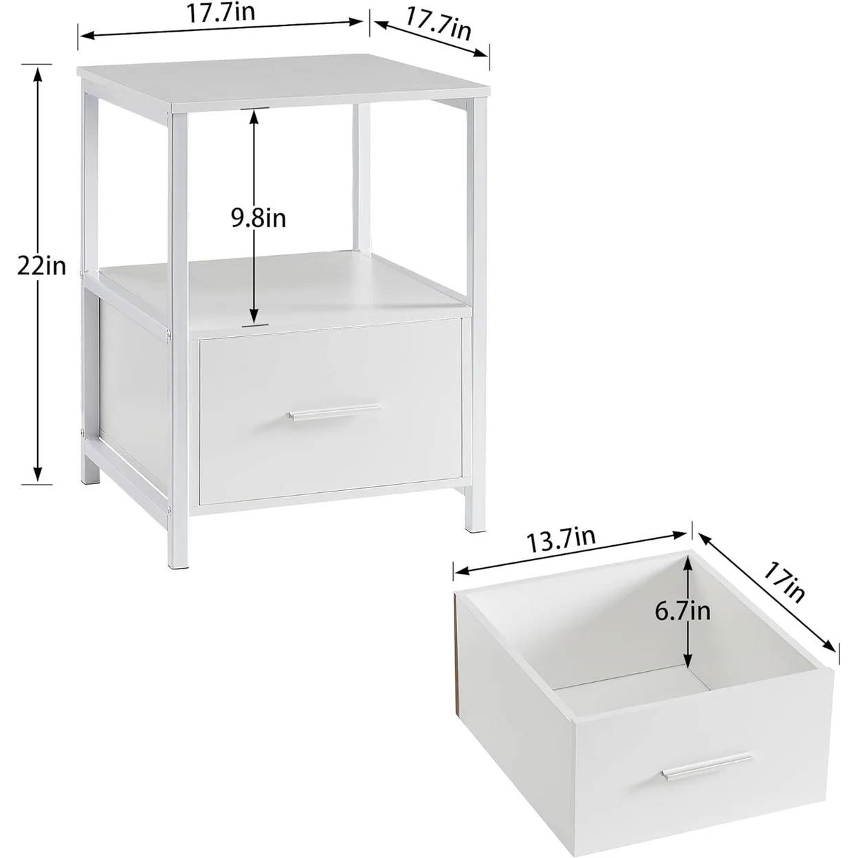 No matter what decor style you are fond of, the Set of 2 - Modern White Metal Wood Side End Table Nightstand with Storage Drawer well goes with the overall interior. Letting your room color be not so monotonous. Made of solid metal frame and engineered wood. Design and material both ensure durability and stability which provides superior strength holding up to 55 lbs. The end table with 2-tier shelf; the open shelf provides ample space for storing and displaying; One large drawer offers additional space for storing private or small items. The appropriate size makes the all-around beside table widely fit for any occasion. A side table beside the couch, a coffee table on the patio, a bedside table in the guest room. All parts and tools are included and clearly labeled, please follow the instruction to assemble the nightstand step by step.