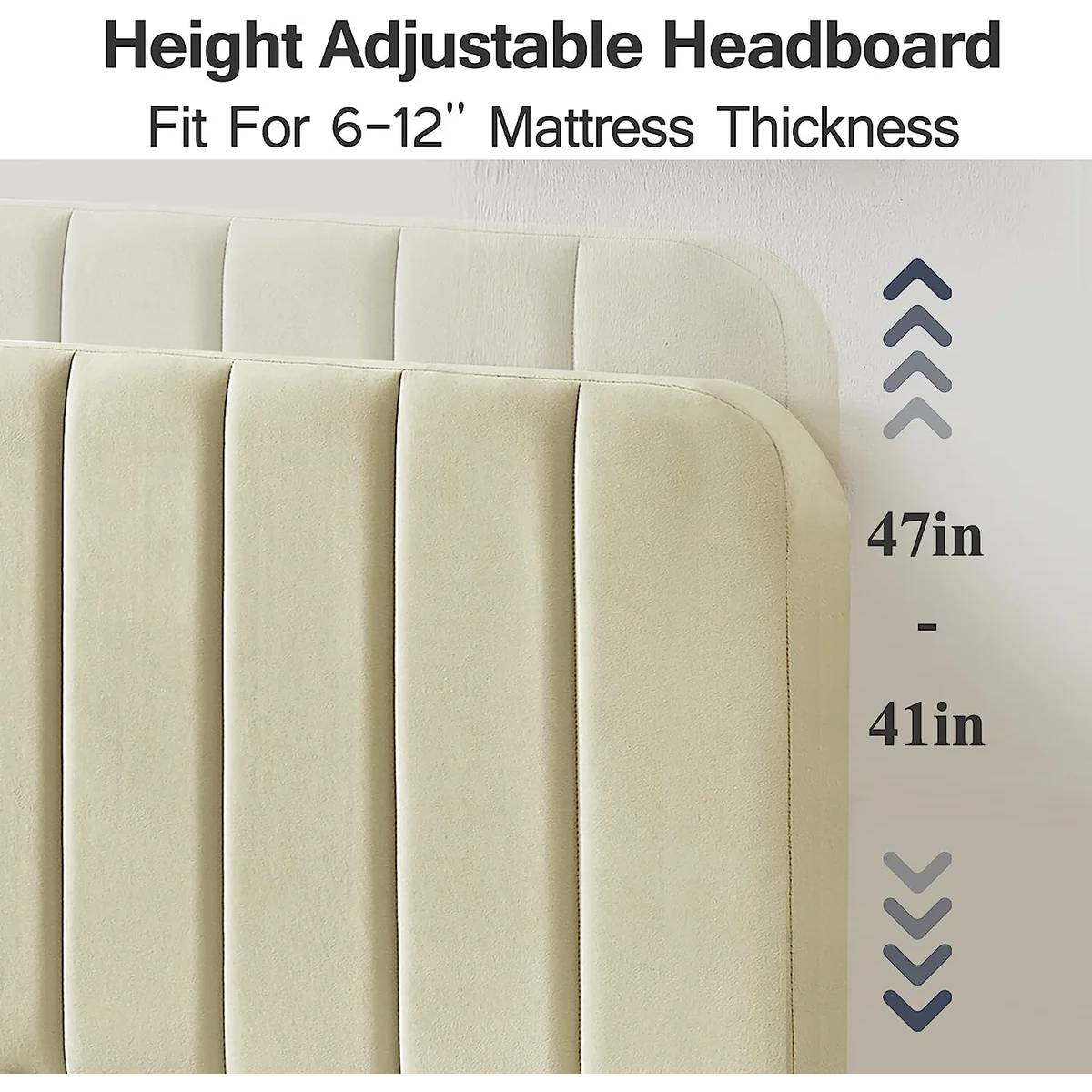 The Queen size Beige Upholstered Platform Bed Frame with Headboard provides dense and strong support because it contains 12 pcs of wooden slats and a metal frame. The center support legs can prevent the bed mattress from sagging and extend the life of your mattress. Queen size supports a maximum weight capacity of 800 pounds. The height-adjustable panel headboard ranges from 43.7" to 47.63", suitable for any thickness and material mattresses, you can adapt it to the optimal height for your needs. The mattress can be put on the bed frame slats directly, Abandon box springs, and you can save more money and time. This upholstered bed frame is suitable for all kinds of mattresses, spring, memory foam, latex, or hybrid mattresses. The sturdy and noise-free frame use foam padding inside. Also with strong support legs to enjoy every silent second for a good night's sleep or while resting for the perfect noise-free bed frame. The headboard of the bed is filled with a sponge, full and not easy to collapse. The resilience brought by the sponge fits the body and can effectively reduce the pain of daily bumps.