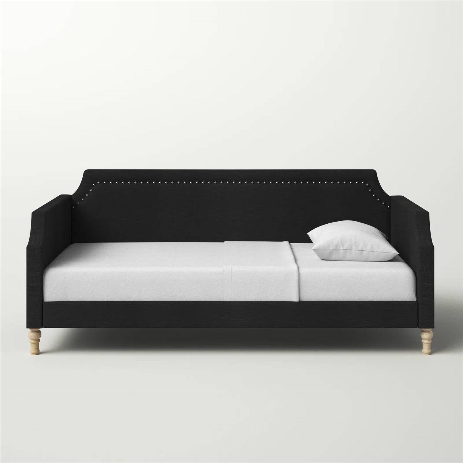 This Twin size Black Polyester Fabric Upholstered Daybed with Nailhead Trim gives you another spot to sleep, whether it's found a home in your guest room or in your main living area. It stands out thanks to its scooped silhouette on the back and sides, along with traditional turned detailing on its four corner legs. Made from solid and engineered wood, this Twin size Black Polyester Fabric Upholstered Daybed with Nailhead Trim is wrapped in a neutral-toned polyester fabric that blends in nicely with almost any style, color palette, or pattern. Nail head trim completes the overall look, and a slat kit provides ample support for a twin mattress (sold separately).