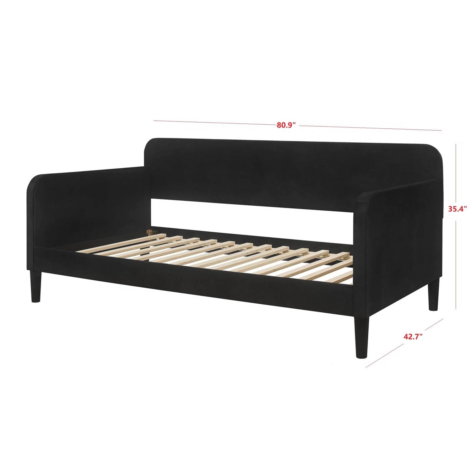 This Twin size Modern Black Velvet Upholstered Daybed brings space-saving comfort to your teen's bedroom or office. Made with a solid and engineered wood frame, it features a sofa-light silhouette with rounded track arms and a tight back balanced on four tapered feet. All-over velvet upholstery adds a contemporary touch of texture, while its neutral hue makes it easy to pair with any aesthetic or color scheme. Plus, it comes with a slat kit that supports a mattress without the need for a box spring. Best of all, this piece is versatile enough to use as a sofa during the day and a bed at night.