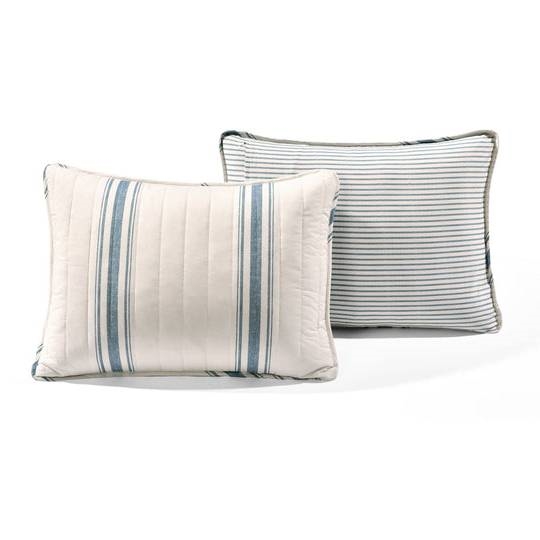 This Farmhouse Stripe Reversible Cotton Quilt Set includes a reversible 100% cotton quilt and 2 matching reversible pillow shams. The background color is a creamy off-white color. The quilt and the sham in this Farmhouse Stripe Reversible Cotton Quilt Set are both safe to machine wash and tumble dry. For best results, please refer to the product labels for full care instructions.