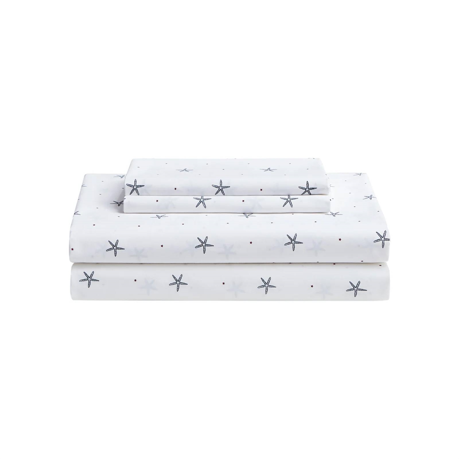 Add a touch of excitement to your bedding ensemble with the Full size Coastal Beach Starfish White Navy Red 100-Percent Cotton Sheet Set. Sheets and coordinating pillowcases utilize the classically cool nautical windowpane cotton percale sheeting layers in a tonal navy and chambray palette ground. The fitted sheet has elastic on all sides which ensures a perfect fit and prevents the sheet from slipping off of the mattress. Machine wash, cold, do not bleach, Tumble dry, gentle and low heat, Iron, low.