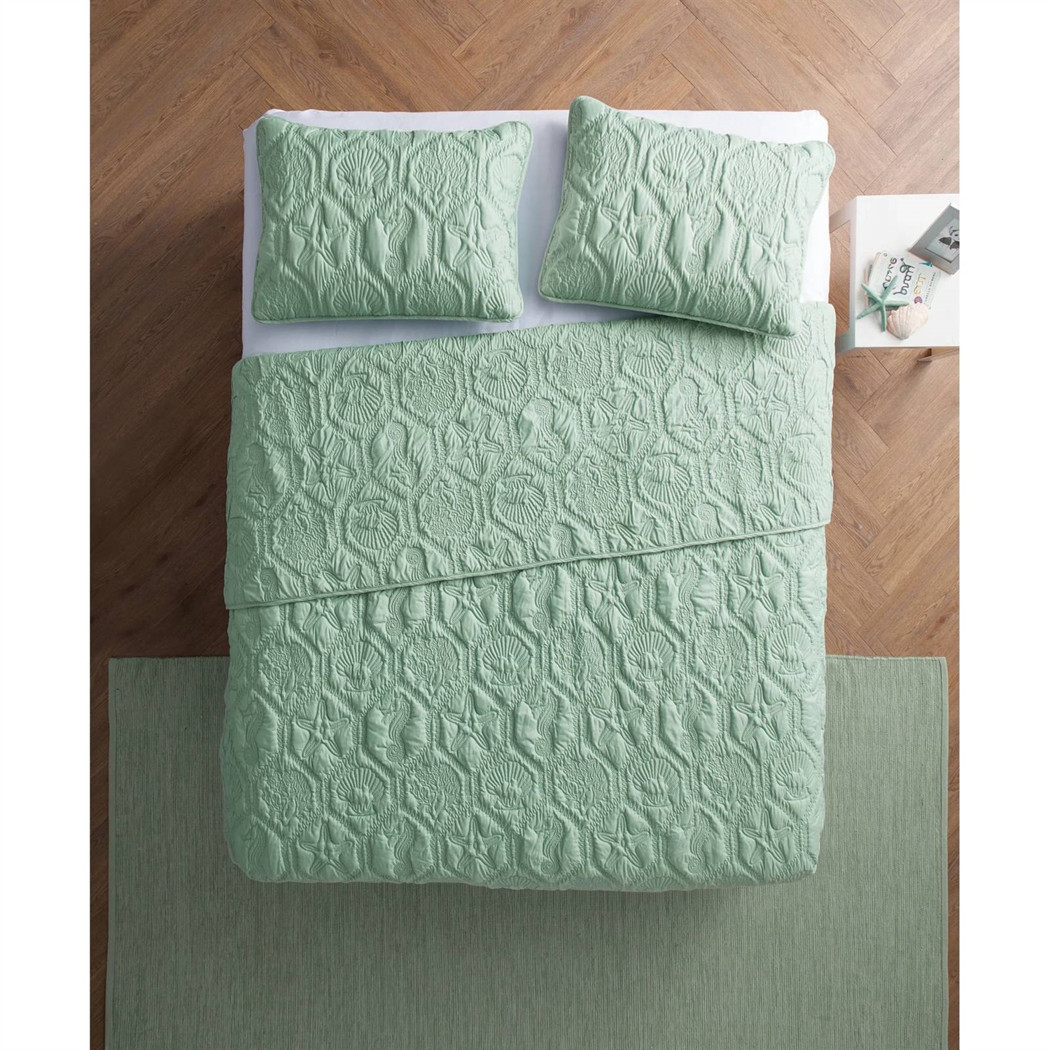 • Queen Coastal Beach Starfish Seashell Seahorse Light Green Teal Quilt Set