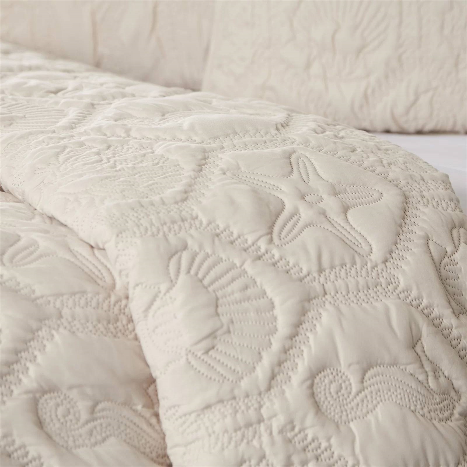 This King size Coastal Beach Starfish Seashells Sea Horse Sand Tan 3-Piece Quilt Set has everything you need to bring a cool, coastal vibe to your space all year long. Featuring a subtle embossed sea life pattern, the set includes coordinating shams for a complete staycation-worth look.