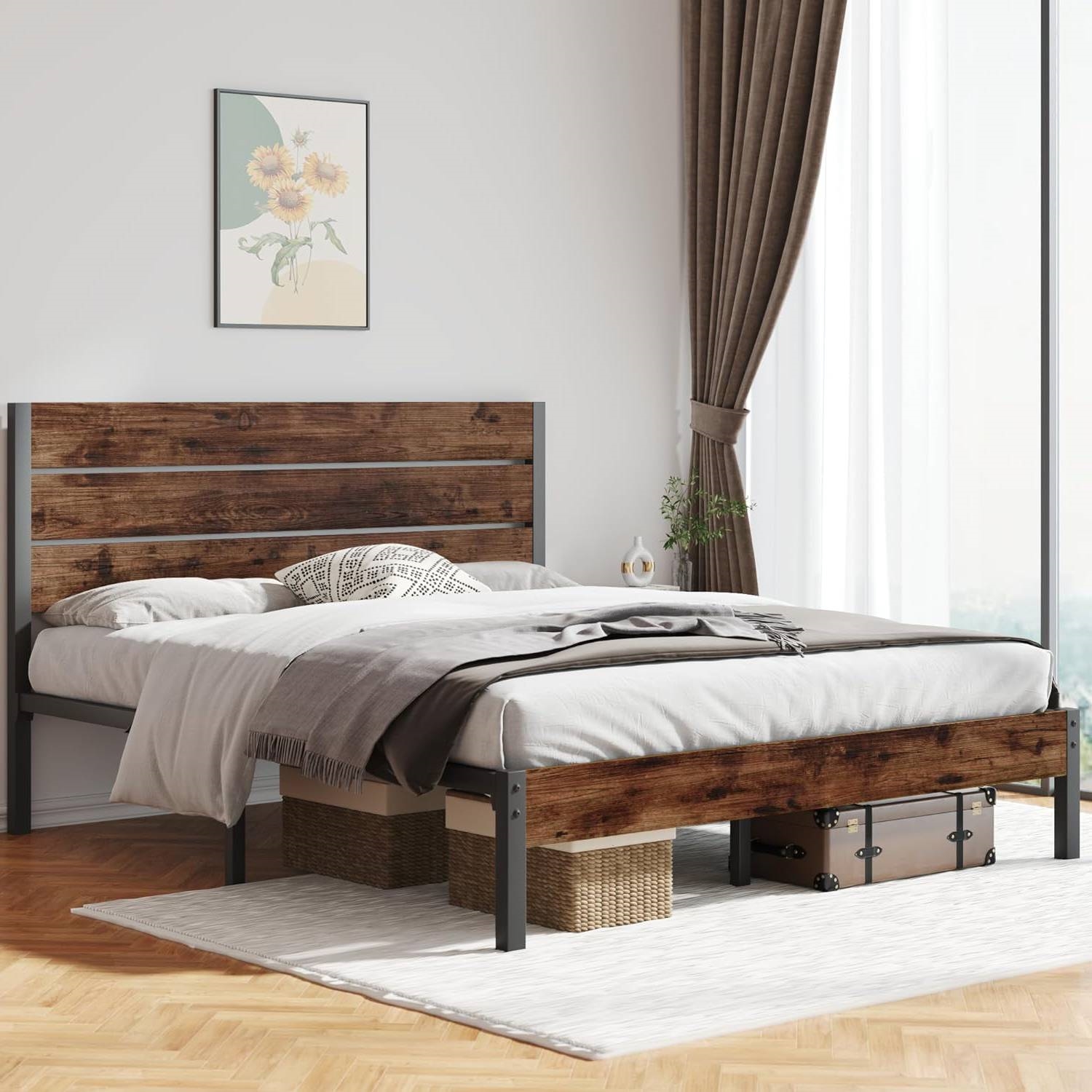 • Queen size Modern Farmhouse Metal Platform Bed Frame with Brown Wood Headboard