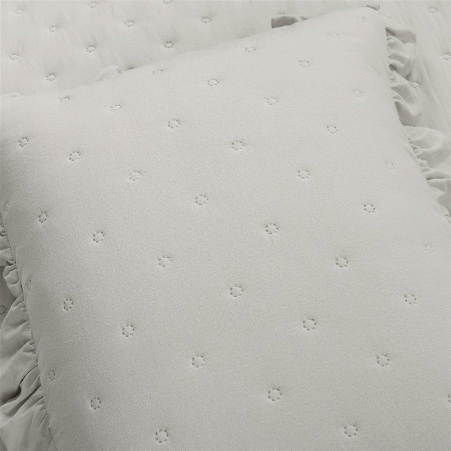 This King Size Lightweight Light Grey Ruffle Reversible Oversized 3 Piece Quilt Set has cozy cottage style with a chic flair. Soft crinkled fabric and quilted tufting create an unmatched texture you'll love to cozy up in. Airy ruffles edge the quilt and two matching shams, giving a feminine touch. The lightweight poly fill ensures all season comfort. Add this delightful Ruffle Reversible Oversized 3 Piece Quilt Set to your primary, guest, or teen's bedroom to complete your charming personal style. The quilted detailing across the fabric adds dimension and extra comfort. You'll love the ruffled edges that give this set extra pizazz. This Ruffle Reversible Oversized 3 Piece Quilt Set includes a soft and luxurious quilt and two matching pillow shams. The pillow shams also have the ruffled edges!
