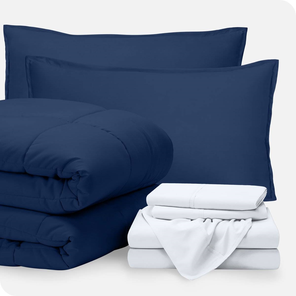 College dorm room approved! This complete comforter set includes everything needed for an easy update of any bedroom. The bed-in-a-bag includes 1 comforter, a white set of sheets, bed skirt, 2 shams, and 2 pillowcases. Each piece is made from microfiber/polyester that's resistant to stains, wrinkles, mold, odors, fading, bed bugs, and dust mites. Classic baffle-box construction of the blanket keeps the filling evenly distributed. Machine washable, moisture-wicking, and non-pilling.
